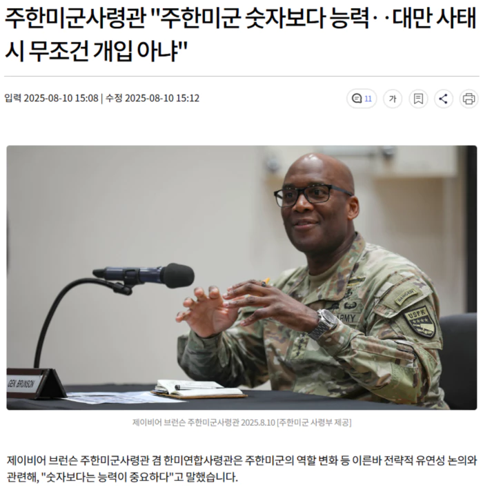 브런슨 사령관은 중국을 염두에 둔 이른바 한미동맹현대화와 관련해선, "모든 정부는 자국의 이익에 따라 결정을 내리기 때문에, 미국이 대만을 지원하면 한국도 함께 해야 한다"는 식의 요구가 결정된 것처럼 여길 필요는 없다"고 말했습니다.