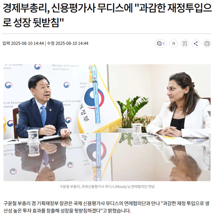 구 부총리는 그제(8일) 정부서울청사에서 열린 무디스 측과의 면담에서 '고령화 등 인구구조 변화가 중장기 재정 여력에 미치는 영향'에 대해 이같이 설명했습니다.