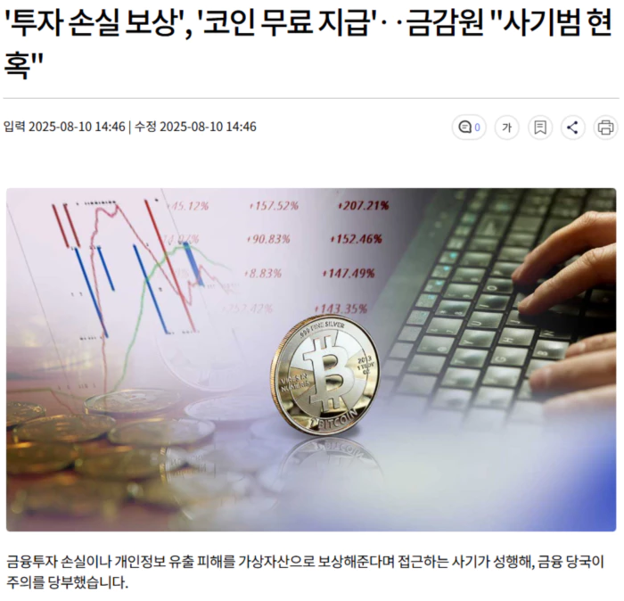 금융감독원은 '투자 손실 보상'이나 '코인 무료 지급' 등을 미끼로 돈을 뜯어내는 투자사기에 소비자경보 '주의'를 내렸습니다.