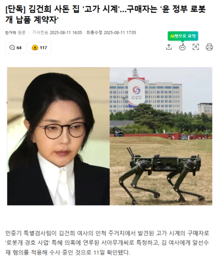 특검팀은 지난달 25일 김 여사 오빠 김진우씨의 장모 자택에서 고급 시계 상자와 보증서를 압수하고, 윤석열 정부 시절 대통령경호처와 로봇개 임차 계약을 맺었던 업체의 전직 대표인 서씨가 이 시계를 구매한 사실을 확인했다. 특검팀은 최근 서씨를 불러 조사했다. 서씨는 지난 대선 때 윤석열 후보에게 개인 후원금 최고액인 1천만원을 낸 인물로, 경호처와 로봇개 임차 운영 수의계약을 체결한 ㄷ업체의 실소유주였다. 특검팀은 김씨 장모 자택에서 고가 시계를 발견한 뒤 김 여사가 서씨에게서 고가의 금품을 받은 혐의(알선수재)로 추가 압수수색 영장을 발부받아 이 시계를 확보했으며, 영장에 김 여사가 금품을 공여받은 시점을 2022년 9월로 적시했다. 이 시기에 경호처는 ㄷ업체와 3개월간 로봇개 임차 계약을 맺었다. 동시에 2대, 최대 4대의 로봇개를 교대 운용해 한달에 600만원씩 3개월 동안 1800만원을 지급하기로 한 내용이었다. .. 후략 ..