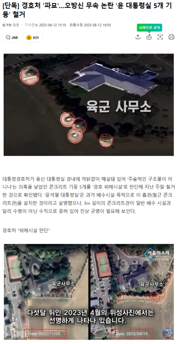 12일 복수의 대통령실 관계자 설명을 종합하면, 경호처는 지난 주말 대통령실 경내에 설치돼 있던 콘크리트 흄관 5개를 경호 위해시설로 판단해 철거 조처했다. 해당 구조물은 대통령실 내 야외정원인 파인그라스 바깥 쪽 부근에 매설돼 있던 3m 가량의 기둥 형태 흄관이다. 전체 흄관 중 옥외로 노출된 부분은 40~50㎝가량이었던 것으로 알려졌다. 매설된 흄관의 거리나 형태는 불규칙했고, 흄관 내부는 특별한 물건 없이 뚫려 있었던 것으로 전해졌다. 이 구조물은 김건희 여사에게 명품가방(디올백) 등을 건넨 뒤 이를 폭로했던 최재영 목사가 지난해 4월 이성만 전 의원과 기자회견을 열어 의혹을 제기하면서 세간에 알려졌다. 당시 최 목사는 ‘2022년 11월 대통령실 위성사진에서는 찾아볼 수 없는 흰색 구조물 다섯 개가 2023년 4월 위성사진에는 보인다’며 ‘용도를 알 수 없는 구조물을 설치한 것은 오방신을 상징하는 무속적 배경일 것’이라고 주장했다. 수직으로 꽂힌 5개의 구조물이 주술적 목적으로 박아둔 쇠말뚝을 연상시킨다는 것이다. 무속을 신봉한 것으로 알려진 김건희 여사는 최근 특검 수사 과정에서 무속인인 건진법사 전성배씨와의 깊은 유착 관계가 드러나고 있다. .. 후략 ..
