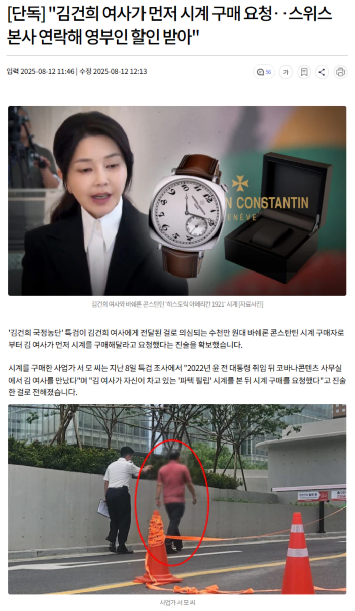 이에 대해 서 씨는 MBC에 김 여사가 외국에 나갈 때 이런 종류의 시계가 필요하다며 가격을 물었고 "내가 바쉐론 콘스탄틴 VIP이기 때문에 바쉐론 콘스탄틴 시계를 싸게 살 수 있다"고 알려줬다고 밝혔습니다. 이후 서 씨는 바쉐론 콘스탄틴 매장에 '영부인 할인이 가능한지' 문의했고, 매장 측이 스위스 본사에서 할인이 가능하다는 답변을 받았다고도 전했습니다. 이렇게 VIP 할인을 받아 5천만 원대 시계를 약 3500만 원에 구입할 수 있었다는 게 서 씨의 주장입니다. 서 씨는 또 "2022년 9월 7일, '히스토릭 아메리칸 1921' 시계를 서울 송파구 시그니엘 호텔에 마련된 VIP 고객 공간에서 수령한 뒤 아크로비스타에 있는 코바나콘텐츠 사무실에서 김건희 여사에게 전달했다"고 MBC 취재진에게 설명했습니다. "김 여사가 시계를 받고 좋아한 게 기억난다"고도 덧붙였습니다. 다만 서 씨는 "구입 자금은 자신의 돈이 아니고 일부는 김 여사에게 받았다"며 뇌물 의혹을 부인하고 있습니다. 그러나 김 여사에게 받은 돈 외에 다른 돈을 누구에 받았는지는 명확히 밝히지 않았습니다. 특검은 서 씨 운전기사의 차량 운행일지를 바탕으로 서 씨가 코바나콘텐츠 사무실을 방문한 사실을 확인한 걸로 알려졌습니다. 또 서 씨에게 시계를 판매한 바쉐론 콘스탄틴 아시아 지역 담당 고위직인 이 모 씨도 최근 불러 조사한 걸로 확인됐습니다. .. 후략 ..