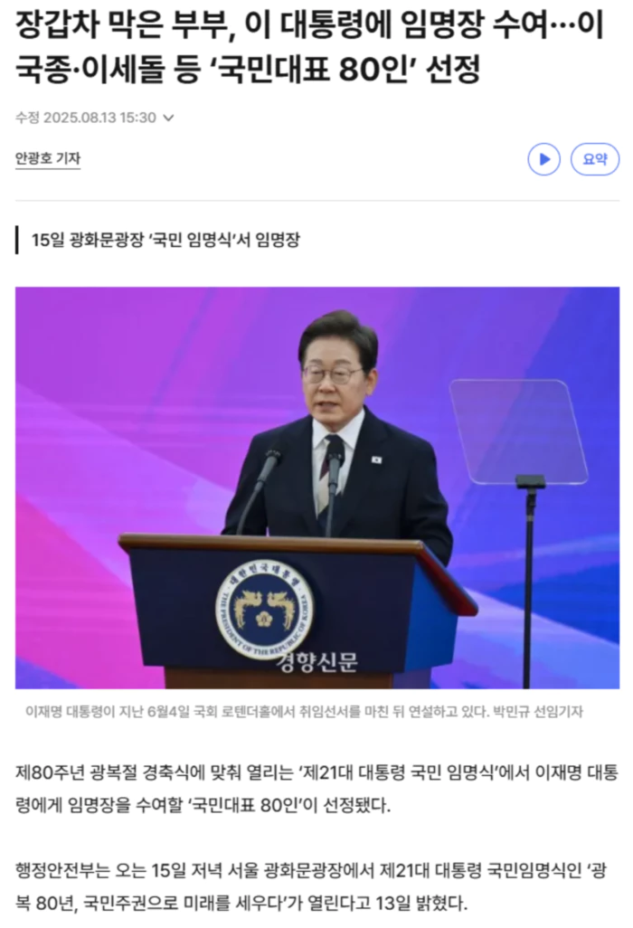 행사에는 국가 주요 인사와 주한외교단 외에 정치, 경제, 사회, 문화·예술·체육, 과학기술, 교육, 노동, 여성, 산업 등 다양한 분야를 대표하는 인사들이 함께 참석한다. 또 인터넷 사전 신청을 통해 초청된 국민 3500명도 참석해 열린 축제의 의미를 더한다. 특히 행사에서는 광복 80주년을 맞아 특별히 선정된 국민대표 80인이 이 대통령에게 임명장을 수여한다. 국민대표 80인에는 지난해 12월3일 계엄 당일 국회로 진입하려던 장갑차를 막으며 국민주권을 지킨 부부, 제78회 칸국제영화제에서 한국 최초 학생 부문 1등을 수상해 문화강국의 이름을 높인 젊은 영화감독 허가영씨, 안전한 대한민국을 위해 노력하는 국군대전병원 이국종 원장과 위기 때마다 국민 안전을 지켜온 구조대원들이 뽑혔다. 또 1977년 한국 최초로 에베레스트산 등정에 성공한 박훈규씨, 2002년 한일월드컵 대표팀 수석코치를 역임한 박항서 감독, 알파고와 세기의 대결을 펼쳤던 바둑기사 이세돌씨, 국내 최초 자연임신으로 다섯쌍둥이를 출산한 김준영·사공혜란 부부 등 함께 행복한 사회를 위해 각지에서 빛을 발하고 있는 이웃들이 참석해 임명식의 의미를 더하게 된다고 행안부는 전했다. .. 후략 ..