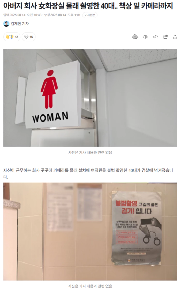 1년 넘게 범행을 이어오던 A 씨는 지난달 18일 화장실을 이용하던 여직원이 화장지 케이스에서 카메라를 발견하면서 덜미를 잡혔습니다.