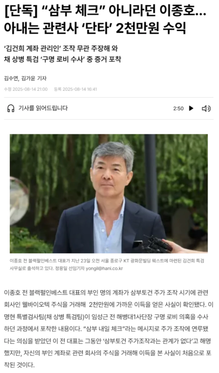 14일 한겨레 취재 결과, 채 상병 특검팀은 2023년 7월 이 전 대표 부인 명의 계좌에서 웰바이오텍 주식을 2억원어치 거래해 2천만원에 가까운 수익을 거둔 내역을 확인했다.