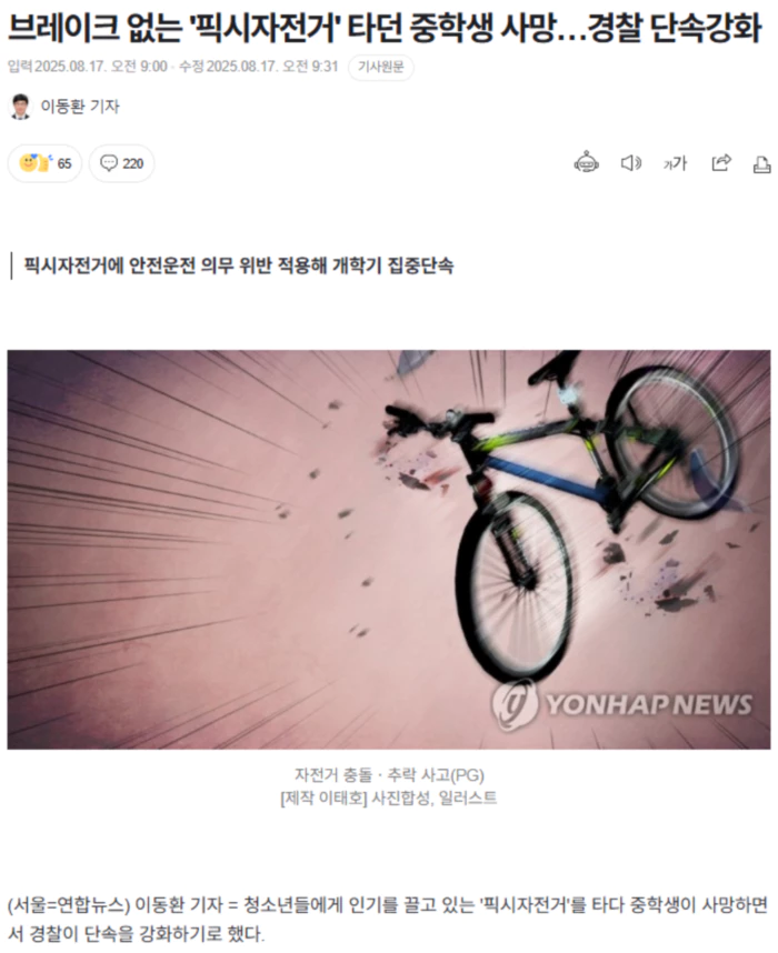 픽시자전거는 변속기나 브레이크 없이 하나의 기어만 사용한다. 본래는 선수용 자전거로, 최근 중·고등학생은 물론 초등학교 고학년까지 유행이 확산하고 있다. 17일 경찰에 따르면 중학생 A군은 지난달 12일 서울의 한 이면도로 내리막길에서 픽시자전거를 타다 속도를 줄이지 못하고 에어컨 실외기와 충돌해 숨졌다. 이에 대응해 경찰청은 "픽시자전거 도로 주행을 안전운전 의무 위반으로 계도·단속하겠다"며 현행 도로교통법을 적극 적용하겠다고 예고했다. 먼저 경찰은 법률 검토를 거쳐 픽시자전거가 차에 해당한다고 판단했다. 이 경우 제동장치를 정확하게 조작·운전해야 한다는 도로교통법 규정을 적용할 수 있다. 그동안 픽시 자전거는 자동차나 원동기에 속하지 않고, 브레이크가 없어 자전거로도 분류되지 않아 '법적 사각지대'에 놓여 있었다. 보행자에게 위해를 줄 우려가 있는 자전거는 도로교통법상 운전금지 조항이 있지만, 픽시자전거는 자전거가 아니라 단속에도 혼선이 있었다. 경찰청은 개학 기간을 맞이해 중·고교 등하굣길 주변에 교통경찰관 등을 집중적으로 배치해 픽시자전거 계도·단속을 할 계획이다. 통상 안전운전 의무 위반은 즉결심판 청구 대상이지만, 픽시자전거를 탄 18세 미만 아동·청소년의 경우에는 부모에게 통보하고 경고 조치를 할 방침이다. 수차례 경고에도 부모가 적절한 조치를 취하지 않으면 아동복지법상 아동학대 방임행위로 보호자도 처벌할 수 있다고 경찰은 밝혔다. 경찰은 또 주말과 공휴일에는 자전거도로를 중심으로 동호회 활동을 하며 픽시자전거를 타는 행위도 집중 단속할 방침이다. .. 후략 ..