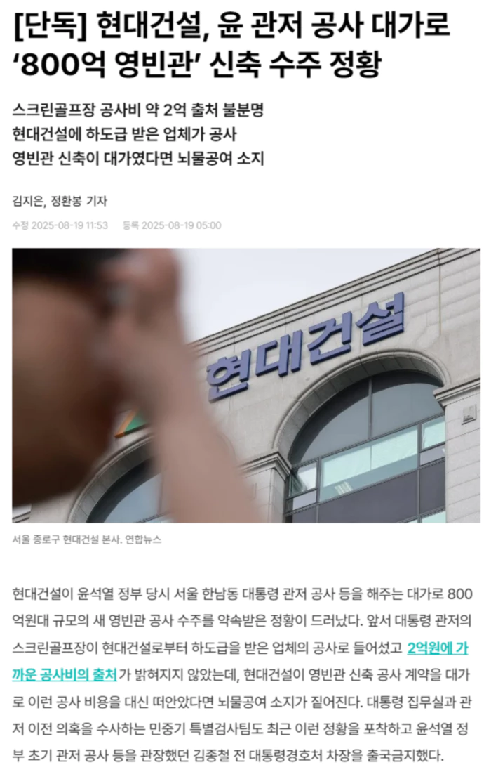 한겨레가 복수의 관저 공사 관계자 취재 내용을 18일 종합해 보니, 현대건설은 윤석열 정부 출범 뒤 대통령경호처한테서 미군으로부터 반환받을 용산 대통령실 앞 부지에 지상 3~4층, 지하 3~4층 규모의 영빈관 공사 수주를 약속받았던 것으로 파악됐다. 청와대에서 귀빈을 맞이했던 영빈관을 용산 대통령실 근처에 신축하기로 하고 이를 현대건설에 맡기기로 한 것이다. 실제로 현대건설 쪽은 2022년 7월께 건물 조감도를 작성해 경호처 쪽에 전달하고 기초 설계작업을 마친 것으로 파악됐다. 실제로 윤석열 정부는 출범 직후 외빈 접견과 각종 행사 지원 등을 위해 새 영빈관(대통령실 주요 부속시설)을 신축하기로 하고 878억6300만원의 예산을 ‘2023년도 예산안 및 기금운용계획안'에 반영한 사실이 2022년 9월에 드러나기도 했다. 경호처는 지난해 초까지도 영빈관 신축을 목표로 절차를 진행했으나 2024년 4월 총선에서 ‘여소야대’ 정국이 재연되면서 거액의 영빈관 공사에 예비비를 사용하는 것을 국회에서 승인받기 어렵다고 판단해 이를 중단한 것으로 전해졌다. 특검팀의 수사는 당시 관저 공사와 영빈관 신축 계획이 윤 전 대통령의 최측근인 김용현 전 국방부 장관(당시 경호처장)과 김종철 당시 경호차장을 중심으로 추진됐다는 점에 초점이 맞춰질 것으로 보인다. .. 후략 ..