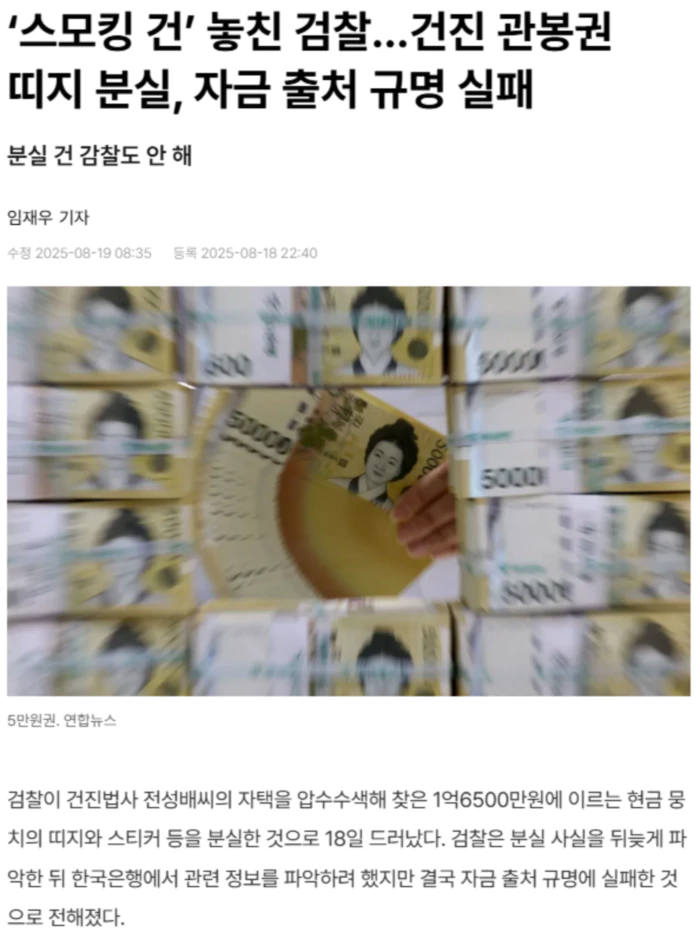 전씨 사건을 수사한 서울남부지검 가상자산범죄합동수사부(부장 박건욱)는 지난해 12월 서울 서초구 전씨의 집을 압수수색해 확보한 관봉권의 띠지와 스티커 등을 조사 과정에서 분실한 것으로 확인됐다. 당시 검찰이 압수한 현금은 5만원권 3300장(1억6500만원)이었고, 이 가운데 5천만원은 비닐 포장이 벗겨지지 않은 상태의 ‘관봉권’이었다. 관봉권은 5만원권 100장 단위로 띠지로 묶여있고, 관봉권 10개 묶음은 비닐로 포장한 뒤 ‘스티커’를 붙인다. 관봉권의 스티커와 띠지에는 △현금 검수 날짜와 시간 △담당자 코드 등 현금의 출처를 식별할 수 있는 정보가 기재돼 있다. 나머지 현금다발 1억1500만원을 묶은 띠지에도 검수관의 도장과 취급지점 등이 표시돼 있었다고 한다. 검찰은 띠지·스티커 등의 분실 사실을 지난 4월에야 인지했고 내부 조사를 통해, ‘압수물을 공식 접수하기 위해 현금을 세는 과정에서 직원 실수로 띠지와 스티커를 버렸다’는 사실을 파악했다고 한다. 당시 서울남부지검 지휘부는 “수사 진행 중에 감찰을 하는 것은 적절하지 않다”고 판단했고, 검찰은 띠지 분실 건에 대한 자체 감찰을 진행하지 않았다고 한다. .. 후략 ..