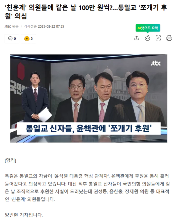 [기자] 대표적인 윤핵관 국민의힘 권성동 의원의 2022년 고액후원자 명단입니다. 통일교 교인, 김모 씨가 3월 24일, 25일, 29일, 31일 그리고 4월 4일 5일에 걸쳐 100만원씩 총 500만원을 후원했습니다. 또 다른 윤핵관, 윤한홍 의원과 장제원 전 의원도 각각 다른 통일교 교인으로부터 같은 날짜에 100만원씩 총 500만원을 후원받았습니다. 당시 서울시당위원장이던 박성중 전 의원은 통일교 교인 3명에게서 후원금을 받았습니다. 이 3명도 같은 날짜에 100만원씩 모두 합쳐 1500만원을 박 전 의원에게 후원했습니다. 같은 날 동시에 조직적으로 후원금을 입금한 겁니다. 특검은 통일교 자금이 조직적인 '쪼개기 후원'을 통해 윤핵관들에게 전달된 것으로 의심하고 있습니다. 통일교 지구장들을 불러 자금의 출처 등도 조사했습니다. 한 지구장은 "2022년 3월 4일 세계본부 자금 3500만원이 국민의힘 중앙당 후원금으로 쓰였고 1000만원은 윤석열 캠프에 있던 한 국회의원 후원회로 전달됐다"는 의견서를 제출한 것으로 전해졌습니다. .. 후략 ..