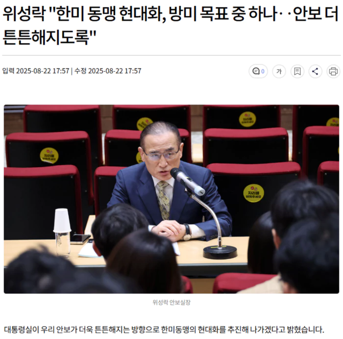 위성락 국가안보실장은 오늘 대통령실에서 기자간담회를 열고 "안보 측면에서의 한미동맹 현대화는 이번 미국 방문의 목표 중 하나"라며 "우리가 생각하는 한미동맹의 현대화는 안보가 더 튼튼해지는 방향의 현대화이자 한미 연합 방위 태세가 더 강화되는 것"이라고 말했습니다.