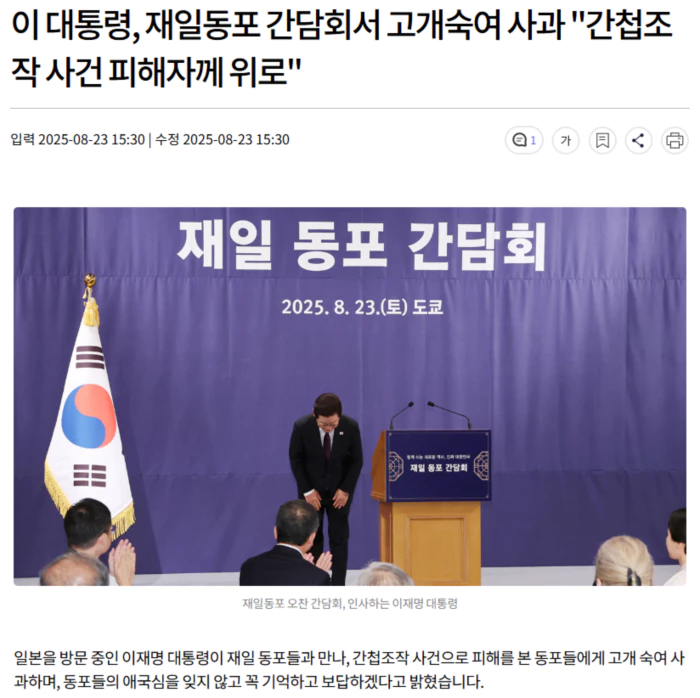 이 대통령은 오늘 오전 일본 하네다 공항에 도착한 뒤 도쿄의 한 호텔로 이동해 재일 동포들과 간담회를 갖고, "최근 80년 광복절을 맞이해 순국선열의 숭고한 희생을 떠올렸을 때 특히 마음이 쓰였던 분들이 바로 재일 동포였다"라고 말했습니다.