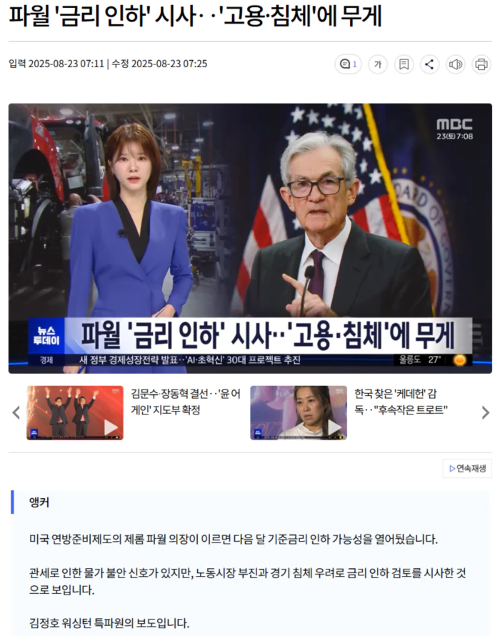 다만, 관세 여파가 단기적일 수도 있다면서 최근 노동시장 침체에 상대적으로 더 무게를 두는 모습이었습니다.