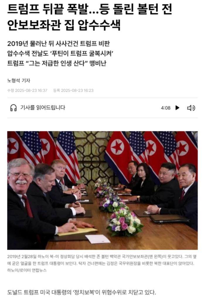 볼턴은 트럼프가 가장 싫어하는 인사중 하나로 꼽힌다. 트럼프 1기 행정부 시절인 2018년 4월 국가안보보좌관에 임명됐으나, 외교·안보 정책에서 초강경 노선을 내세우면서 자주 충돌했고 2019년 9월 인사조치로 물러났다. 그뒤 볼턴은 맹렬한 반트럼프 인사로 돌아서 그의 국정 운영을 사사건건 비판해왔다. 트럼프는 이에 볼턴이 기밀 정보를 빼돌렸다는 주장을 수년간 거듭하며 압박했고 올해 1월 취임 직후 볼턴에 대한 정부 비밀경호국의 경호를 중단시킨데 이어 자택과 사무실 압수수색이란 초강수를 둔 것이다. 볼턴은 압수수색 전날에도 블라디미르 푸틴 러시아 대통령이 알래스카 정상회담에서 트럼프를 ‘굴복시켰다'고 비난했다.