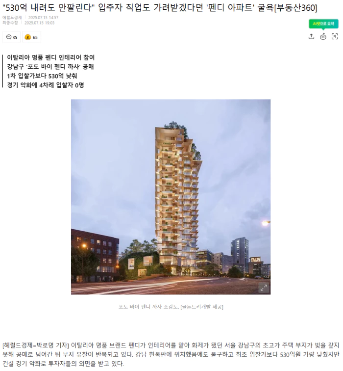 이 부지에는 지하 7층~지상 20층 규모로 아파트 29가구와 오피스텔 6실 등 초고가 주거시설이 들어설 예정이었다. 명품 브랜드 펜디의 인테리어 가구 브랜드 ‘펜디 까사’가 인테리어를 맡았고, 분양가가 200억원대로 책정돼 화제가 됐다. 더욱이 펜디 까사 본사가 고객 직업과 자산을 확인한 후 입주 여부를 결정하기로 해 입방아에 오르내렸다.