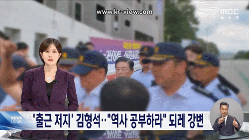 광복절 경축식 기념사 논란으로 사퇴 요구가 거세지고 있는 김형석 독립기념관장에 대해 독립유공자 후손들이 출근저지에 나섰습니다.
