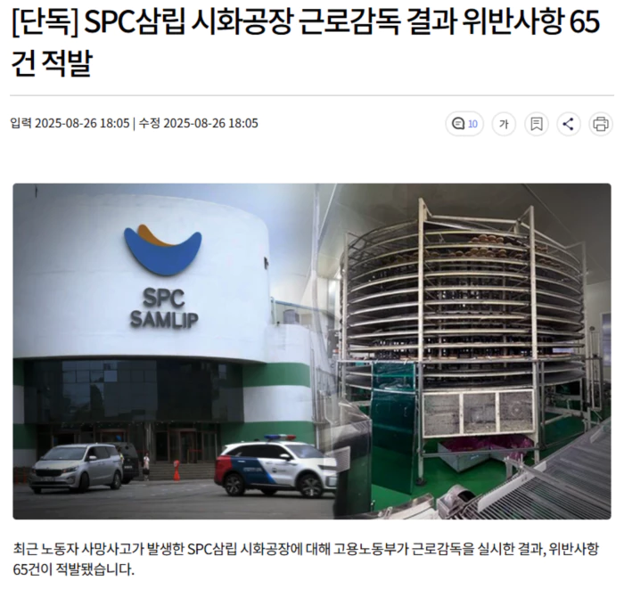 고용노동부가 더불어민주당 김주영 의원실에 제출한 자료에 따르면, 노동부는 지난 5월부터 3주간 SPC삼립 시화공장에 대한 현장 감독을 실시한 결과 이같은 위반 건수를 적발했습니다.