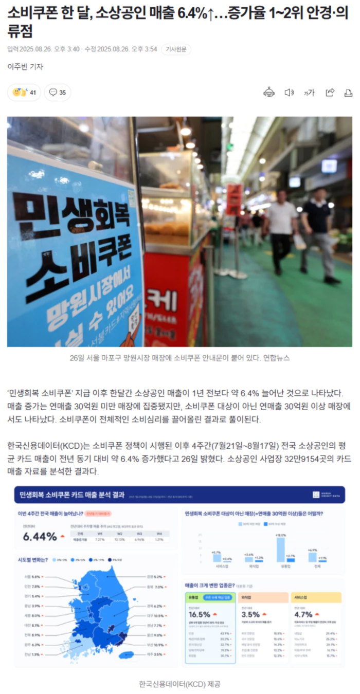소비쿠폰 지급 2주차에서 매출 증가 효과가 가장 큰 것으로 나타났다. 주 단위로 전년 동기 대비 매출 증가율을 살펴보면 7.3%(1주차)→10.1%(2주차)→7.0%(3주차)→1.2%(4주차)였다. 업종별로 보면, 전년 동기 대비 매출 증가율이 가장 큰 곳은 유통업(16.5%)이었다. 세부적으로 살펴보면, 안경점(44.0%) 매출이 가장 높은 비율로 증가했다. 패션·의류(33.2%), 완구·장난감(32.7%), 전자담배(31.3%), 화장품(30.1%) 등도 모두 30% 이상 증가했다. 한국신용데이터는 “상대적으로 고가라 미뤄왔던 필수 내구재 구매와, 자기만족형 소비가 활발히 이뤄진 결과”로 해석했다. 서비스업(4.7%↑)에서는 네일숍 매출 증가율(29.4%)이 가장 높았다. 다음으로 비뇨기과(25.2%), 가정의학과(20.1%), 미용·피부관리(16.1%), 사우나·목욕(15.7%) 순이었다. 외식업(3.5%↑)에서는 피자 전문점(18.8%), 국수 전문점(18.6%), 배달음식 전문점(14.2%), 초밥·롤 전문점(13.2%), 만두 전문점(12.3%) 순으로 매출 증가율이 높았다. .. 후략 ..
