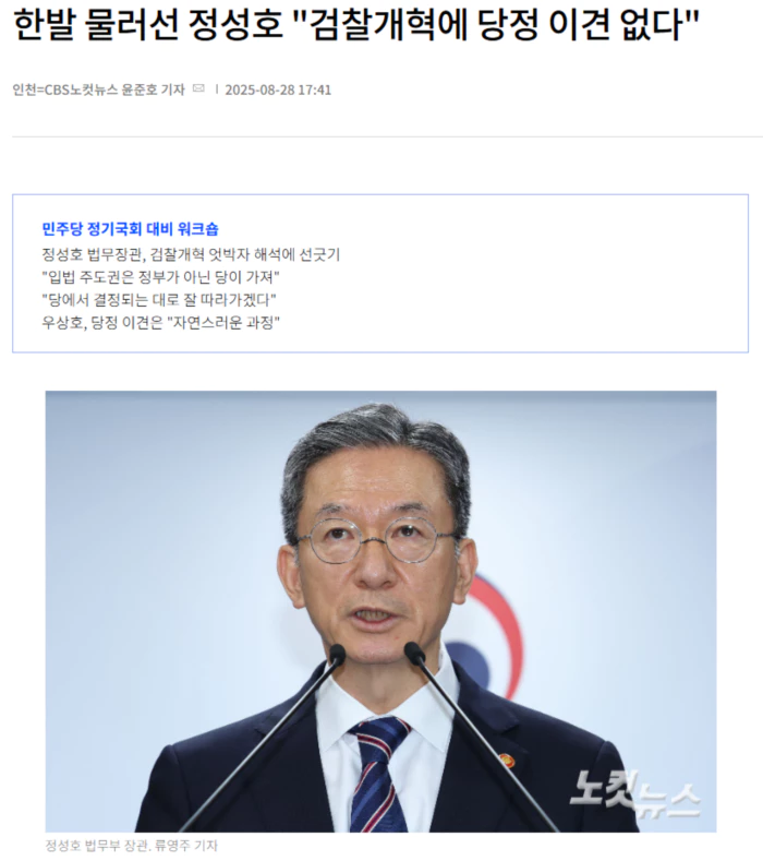 정성호 법무부 장관이 여당에서 추진중인 검찰개혁안을 두고 당정 사이 엇박자가 표출되고 있다는 정치권 안팎의 해석에 "이견은 없다"고 선을 그었다. 정 장관은 28일 인천 파라다이스시티에서 열린 '정기국회 대비 민주당 국회의원 워크샵'에서 기자들과 만나 "입법의 주도권은 정부가 아니라 당이 갖고 있다. 당에서 결정되는 대로 잘 논의해 따라가겠다"며 이같이 밝혔다. 정 장관은 또 '중대범죄수사청(중수청)을 법무부 산하에 두는 게 합리적이냐'는 질문에 "제 개인적인 의견은 없다"며 "지금까지 각계 의견을 제가 전달했는데 어쨌든 입법 중심은 민의의 대변자인 국회의원들 아니겠나"고 답했다. 정 장관의 이같은 반응은 검찰개혁에 미세조정이 필요하다는 취지로 언급한 최근 입장에서 한발 물러난 모양새다. 앞서 정 장관은 지난 25일 국회 예산결산특위에서 "중수청·경찰·국가수사본부가 행정안전부 밑에 들어가면 1차 수사기관들에 권한들이 집중된다"며 "상호 인적 교류가 가능한 만큼 어떤 문제가 발생할지 고려해야 한다"고 말했다. 현재 민주당의 검찰개혁 구상안에는 검찰청 폐지 후 신설될 중수청을 행안부 산하에 두는 내용이 담겨있다. 정 장관의 발언을 두고 정치권에서 그가 민주당이 준비중인 검찰개혁에 이견을 내놨다고 해석한 이유다. 이날 워크숍에 참석한 대통령실 우상호 정무수석도 당정 사이 이견 논란을 진화하고 나섰다. .. 후략 ..