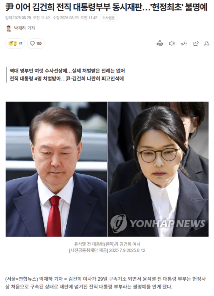법조계에 따르면 김 여사 관련 의혹을 수사하는 민중기 특별검사팀은 이날 김 여사를 자본시장법 위반, 정치자금법 위반, 특정범죄 가중처벌법상 알선수재 혐의로 구속기소 했다. 지난달 2일 현판식을 열고 수사를 개시한 지 59일 만이다. 이로써 김 여사는 역대 영부인 중 첫 수사기관 공개 소환, 첫 구속에 더해 첫 구속기소라는 오욕의 기록을 남기게 됐다. 그동안 대통령 부인이 피의자로 조사받거나 처벌받은 사례는 없었다. 노태우 전 대통령의 부인 김옥숙 여사는 노 전 대통령이 비자금을 조성하면서 대기업 등에서 별개로 불법 자금을 받았다는 의혹을 받았다. 하지만 검찰은 증거불충분 등을 이유로 김옥숙 여사를 소환조사하지는 않았다. 전두환 전 대통령의 부인 이순자 여사는 대통령 부인 중에서는 처음으로 검찰 조사를 받았다. 이 여사는 2004년 5월 전 전 대통령의 비자금 사건에 관해 대검찰청 중앙수사부에 참고인 신분으로 출석해 조사받았다. 다만 조사가 비공개로 이뤄져 소환 사실은 귀가 후인 당일 밤에야 알려졌다. 노무현 전 대통령의 부인 권양숙 여사도 2009년 4월 이른바 '박연차 게이트' 사건과 관련해 부산지검에 참고인 자격으로 소환돼 조사받았다. 이 역시 비공개로 이뤄졌으며 수사는 노 전 대통령이 서거하면서 종결됐다. 이명박 전 대통령의 부인 김윤옥 여사는 2018년 이 전 대통령 자동차부품회사인 다스(DAS) 관련 자금 횡령 및 뇌물수수 혐의에 대해 참고인 조사 대상에 올랐지만 실제 조사가 이뤄지지는 않았다. 문재인 전 대통령의 부인 김정숙 여사는 2022년 3월 옷값에 청와대 특수활동비(특활비)가 사용됐다는 의혹으로 경찰에 고발됐지만 경찰은 '혐의없음'으로 불송치 처분했다. 검찰 역시 김정숙 여사의 '인도 타지마할 외유성 출장 의혹'과 관련해 증거 불충분으로 불기소 처분을 내렸다. 역대 대통령이 재판에 넘겨지거나 처벌받은 사례는 많다. 1995년 전 전 대통령과 노 전 대통령이 내란과 뇌물 혐의로 구속기소 돼 각각 무기징역과 징역 17년을 선고받은 바 있다. 박근혜 전 대통령은 2017년 3월 국정농단 관련 혐의로 구속됐으며 이후 구속 상태로 재판에 넘겨져 징역 20년을 선고받았으며 이 전 대통령은 2018년 다스 의혹과 관련해 특정범죄 가중처벌법상 뇌물수수 등 혐의로 징역 17년을 선고받았다. .. 후략 ..