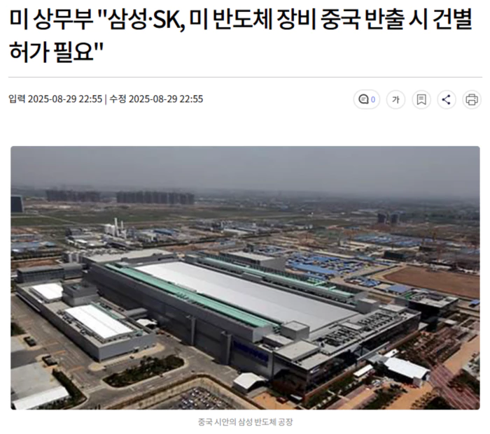 현지시간 29일 미연방 관보에 따르면 미 상무부는 삼성전자와 SK하이닉스, 인텔이 중국 내 생산 시설에 미국산 반도체 제조 장비를 공급할 때 일일이 허가를 받을 필요가 없도록 한 포괄 허가를 폐지하기로 했습니다.