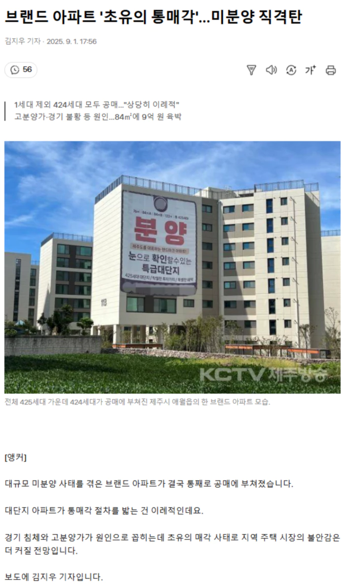 [기사] 지난해 12월 준공된 제주시 애월읍에 위치한 한 아파트입니다. 시내 인근에 대단지 브랜드 아파트가 들어선다는 소식에 조성 전부터 관심을 끌었습니다. 하지만 총 425세대 가운데 400세대 이상이 분양되지 못하면서 단지 전체가 사실상 텅 빈 건물로 남았습니다. 대규모 미분양 사태의 주된 원인은 고분양가와 경기 불황. 전용면적 84㎡의 분양가가 9억원에 육박하면서 실수요자들이 외면했고 경기 침체에 외지인 투자도 위축됐습니다. <스탠드업 : 김지우> “처참한 분양 성적표를 받아든 이 아파트는 결국 자금난을 버티지 못하고 통매각 절차를 밟게 됐습니다.” 한국자산관리공사 등에 따르면 해당 아파트는 분양을 받은 1세대를 제외한 424세대와 상가 한 곳이 공매에 부쳐졌습니다. 감정평가액은 3천336억원, 최저입찰가는 이보다 높은 4천6억원입니다. 업계에서는 개별 세대가 아닌 전체 단지가 공매로 나온 건 이례적이라는 평가입니다. <이동화 / 한국공인중개사협회 제주시지회장> “이례적입니다. 상당히 이례적이고 수요 자체가 과거에는 투자적인 목적도 있었다고 봅니다. 그런데 최근에는 실제 거주를 목적으로 하는 수요이기 때문에 SOC(사회간접자본)라든가 이런 부분을 세밀하게 소비자들이 보고 가성비를 따지는 측면이 있다고 봅니다.” 시공사는 시행사와 채권자들을 대상으로 공사대금 반환 청구 소송을 진행 중이며 분양광고 대행사와 수분양자도 소송을 제기한 것으로 알려졌습니다. .. 후략 ..