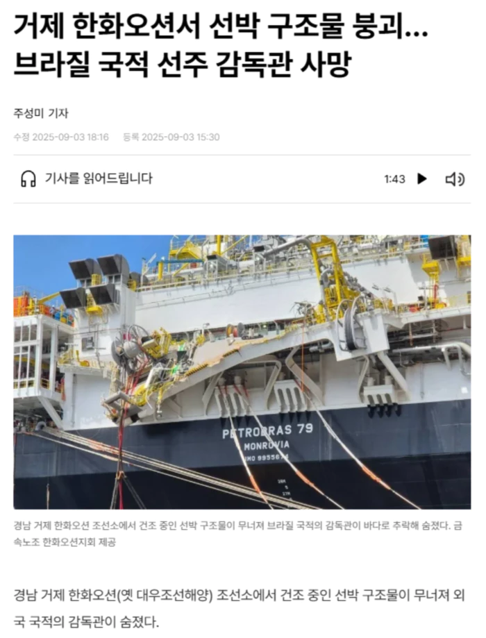 3일 창원해양경찰서와 경남소방본부 등의 말을 들어보면, 이날 오전 11시30분께 한화오션 조선소에서 건조 중인 15만톤급 선박의 꼬리 쪽 구조물이 부서지며 아래로 휘어졌다. 이 사고로 배 위에 있던 브라질 국적의 선주 쪽 감독관 ㄱ(30대)이 바다에 빠졌다.