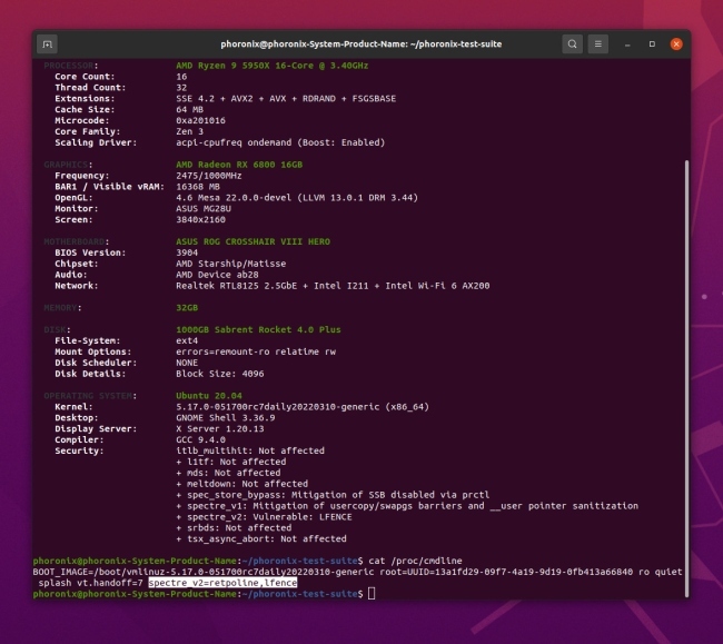 최신 Linux 5.17 커널에서 몇 가지 AMD Zen 3 시스템을 부팅했는데 현재 기본값은 일반 Retpolines이고 성능은 시스템을 재부팅하고 "spectre_v2=retpoline,lfence" 스위치를 사용하여 되돌아간 후 벤치마크를 반복하는 것과 비교되었습니다.
