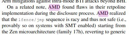 Vrije Universiteit Amsterdam의 VUSec 팀은 BHI/Spectre-BHB 백서 에서 AMD의 현재 LFENCE/JMP 기반 Retpolines의 Spectre V2 소프트웨어 완화 전략이 부적절하다고 언급했습니다.