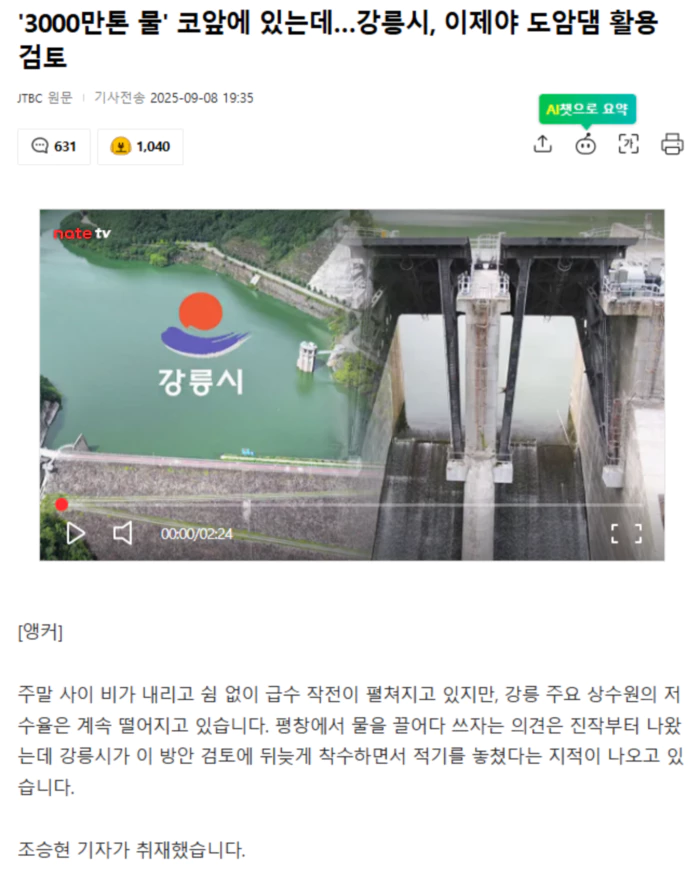 [기자] 강릉 지역 주 상수원인 오봉저수지 저수율은 12.4%입니다. 매일 0.3%P 정도씩 떨어지고 있습니다. 이대로면 열흘 뒤쯤 저수율 10%선이 무너집니다. 밤사이 '시간제 단수'에 들어가는 마지노선입니다. 지난 주말부터 상수도 공급이 끊긴 대단지 아파트에선 불편이 현실이 됐습니다. 당장 단수는 없다던 설명과 달리 일부 가정에선 물이 끊겼습니다. [최양숙/강원 강릉시 홍제동 아파트 거주 : 소변 같은 경우는 바로 내리지 않고 서너 번 모아놨다가 물을 받아놨던 걸 부어서 내리기도 하고…] 단수 위기가 눈앞에 닥치면서 평창 도암댐 물을 끌어다 쓰자는 이야기가 다시 나오기 시작했습니다. 도암댐은 지난 1990년 발전용으로 만들어졌습니다. 지하터널로 강릉까지 물을 보내 전기를 만들고 남대천으로 방류하는 방식입니다. 하지만 수질 오염 논란으로 2001년 가동을 멈췄습니다. 강릉에서 15㎞ 떨어진 이곳 도암댐에는 물 3000만 톤이 담겨 있습니다. 이렇게 많은 물을 가까이에 두고도 강릉시는 지금까지 용수 공급에 반대해 왔습니다. 수질이 나쁘고, 수온이 낮다는 이유였습니다. 그런데 강릉시가 돌연 태도를 바꿨습니다. 15만 톤 물이 담긴 기존 지하터널에 20m 길이 임시 수로를 연결하는 설계에 들어간 겁니다. 하지만 빨라야 오는 20일부터 하루 만 톤씩 물을 공급받을 수 있습니다. 여기에 환경부 수질검사에, 시민과 전문가 의견을 듣는 절차까지 거친 뒤 결정할 계획이라 더 늦어질 수 있습니다. .. 후략 ..