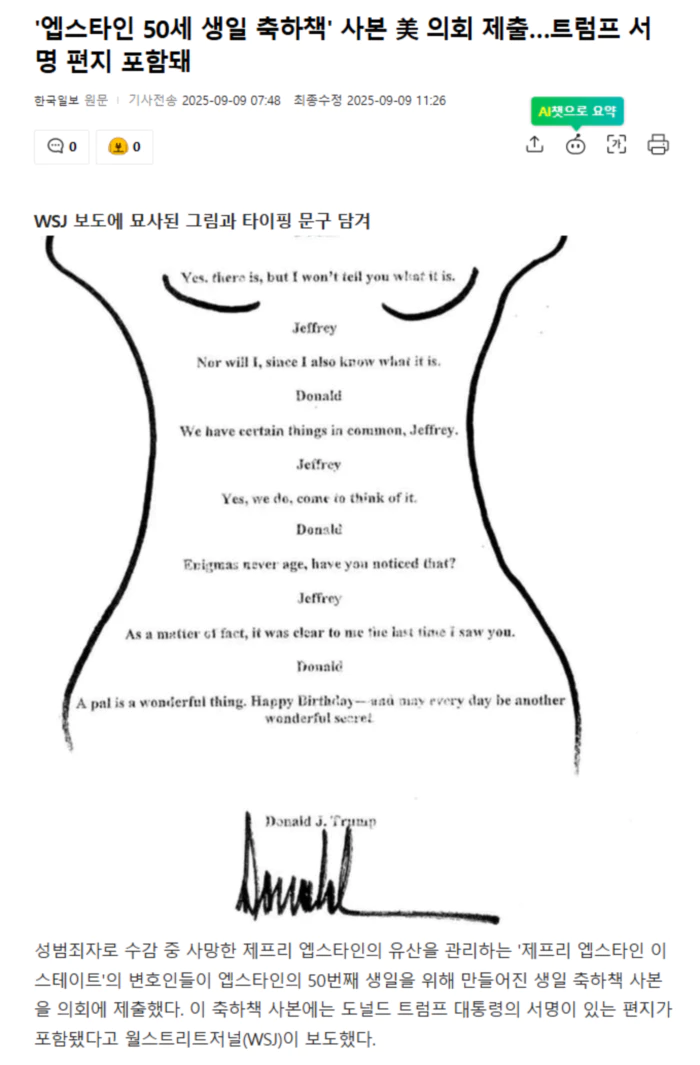 트럼프 대통령은 WSJ가 7월 이 편지에 대해 언급하자 편지가 존재하지 않는다고 주장하며 WSJ와 모기업 등에 100억 달러(약 13조8,500억 원)의 소송을 제기한 바 있다.