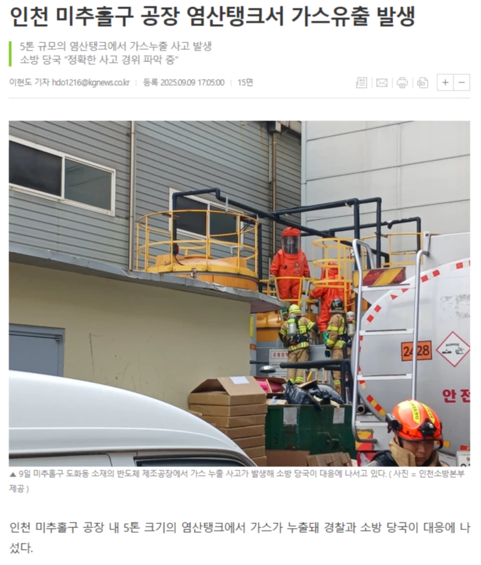 (출처: 인천 미추홀구 공장 염산탱크서 가스유출 발생)