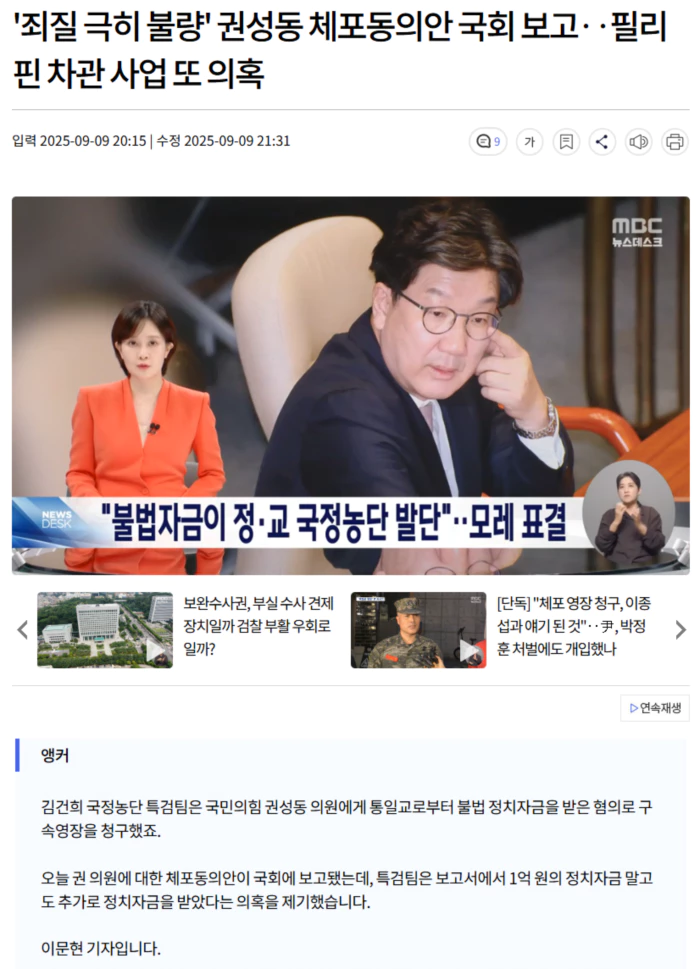 "국회의원 권성동 체포동의안이 제출되었습니다."