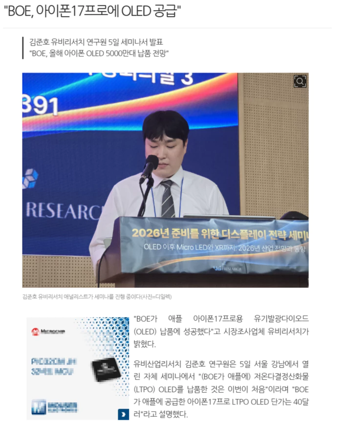 그는 "BOE는 올해 아이폰 OLED를 5000만대 공급할 것"이라며 "(BOE의 연도별 아이폰 OLED 출하량은) 2021년 1870만대, 2022년 3200만대, 2023년 4100만대, 2024년 4300만대 등으로 늘었다"고 설명했다. BOE는 지난 2021년 처음 아이폰12의 교체용(리퍼비시) OLED 패널을 공급했다. BOE를 포함한 중국 패널 업체들의 스마트폰 OLED 출하량은 증가하고 있다. 올해 상반기 출하량은 2억6000만대로, 2022년 상반기 1억대의 2.6배 수준이다. 김 연구원은 "(스마트폰 OLED 시장에서 중국 패널 업체 점유율은) 1분기 53.4%, 2분기 54.3%였다"며 "한국 패널 업체를 완전히 넘어섰다"고 평가했다. 중국 내수 시장의 탄탄한 수요 덕분이다. 김 연구원은 "2029년 중국 패널 업체의 스마트폰 OLED 출하량은 60%를 넘어설 것"이라며 "한국은 삼성디스플레이 점유율은 30%, LG디스플레이 점유율은 9.4%로 예상된다"고 말했다. 중국 내 OLED 업체는 BOE와 CSOT, 비전옥스, 티안마, 에버디스플레이 등이 있다. 김 연구원은 에버디스플레이를 제외한 4개 업체가 중국 60% 점유율을 나눠 가질 것이라고 예상했다. 반면 스마트폰 OLED 매출에서는 2029년에도 한국이 우위를 유지할 것으로 전망했다. 김 연구원은 "2029년 전세계 스마트폰 OLED 매출의 40%를 삼성디스플레이가, 20%를 LG디스플레이가 차지할 것"이라며 "2029년까진 한국 업체가 앞설 것"이라고 말했다. 한국 패널 업체의 OLED 공급 가격이 중국 업체들보다 높기 때문이다. .. 후략 ..