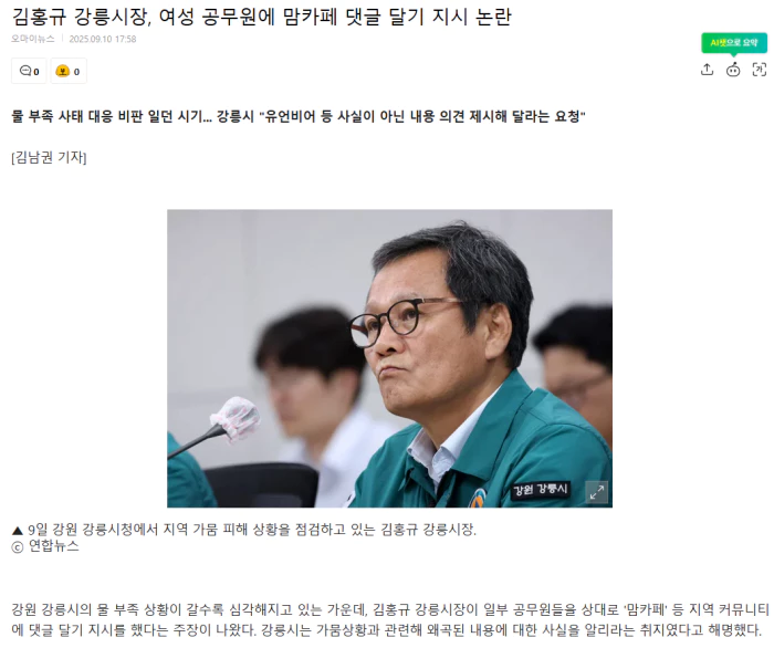 제보자에 따르면, 김홍규 시장은 지난 8월 29일 오전 11시 강릉시 여성 공무원 위주의 회의를 소집했다. 참석 대상은 청내 여성 계장 공무원, 차석 7급 고참 여성 공무원으로 62명 정도로 파악됐다. 앞선 회의가 늦게 끝나면서 11시가 조금 넘은 시각에 회의장에 도착한 김 시장은 가뭄 및 물 부족과 관련해 '언론과 인터넷(SNS, 커뮤니티 등)에 잘못된 정보와 비판적인 내용이 많다'는 내용의 지적을 한 뒤, 그것들이 '시민을 자극하고 분열을 조장하는 행위'라는 취지의 발언을 한 것으로 전해졌다. 김 시장은 해당 행위에 직원들이 적극적으로 대처해야 한다며 특히 강릉 '맘카페'에 직원들이 직접 댓글을 달아야 한다고 주문했다. 맘카페 회원들이 시정을 비판하는 것은 잘못된 정보를 가지고 있기 때문이며 공무원들이 허위 내용을 바로 잡기 위해 인터넷에 글도 올리고 댓글도 달아야 한다는 취지였다. 이 같은 김 시장의 지시는 이후 각 부서 과장들에게도 전달됐다. 강릉시청 A과장은 같은 날 오후 1시께 내부 통신망을 통해 각 부서 과장들에게 "허위사실에 대한 댓글도 함께 부탁드린다"고 주문하며 댓글 달기를 재차 독려했다. 이에 대해 강릉시는 가뭄대응에 대한 잘못된 정보를 바로잡기 위한 취지였다는 입장이다. 강릉시 관계자는 9일 "(김 시장이) 가뭄 대응에 대한 전반적인 설명과 오봉저수지 방류 등 유언비어에 대해 설명을 직접 했고, (공무원) 여러분들이 물 절약을 해야 하니 주도적으로 (대응)해 달라는 당부 요청이었다"라며 "사실이 아닌 내용에는, 본인들이 알고 있는 내용에 대해 의견을 제시해달라는 요청이었다"고 밝혔다. 김 시장이 댓글 대응을 지시한 시기는 '강릉시의 물 부족 상황이 사전 준비 부족 때문'이라는 비판이 한창 제기될 때였다. 앞서 강릉시는 8월 20일부터 제한 급수를 실시한다고 발표했다. 특히 인접한 속초시가 2018년부터 지하저류댐 건설 등 수년간의 준비로 물 부족 문제를 해결했다는 점과 비교하는 언론 보도가 많았다. 게다가 강릉시가 제한급수 조치를 발표할 때 속초시는 물 축제를 진행했다는 상황도 지역 주민들의 감정을 더욱 자극했다. 더불어민주당 강릉시 지역위원회도 지난 8월 21일 "사상초유 강릉시 급수제한! 시민에게 불편만 떠넘기는 김홍규 강릉시장은 지난 3년 동안 무엇을 했는가? 김홍규 강릉시장은 하늘을 탓할 것이 아니라 본인의 무능함을 인정하고 시민에게 사과부터 해야 한다"고 비판에 나서기도 했다. .. 후략 ..