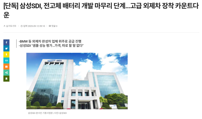 이에 삼성SDI가 공급하는 전고체 배터리 공급은 고급 외제차 완성업체 중심이 될 가능성이 매우 높다는 것이 업계의 설명이다.