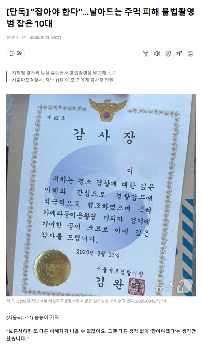 지난달 17일 오후 신촌에서 홍대입구역으로 향하는 지하철 2호선 열차. 좌석에 앉아 있던 이 모 군(18)은 옆자리에 앉은 남성이 휴대전화를 몰래 보는 것이 수상해 보였다. 화면을 자세히 보니 파란색 원피스를 입고 계단을 올라가고 있는 여성의 치마 속을 찍은 영상이 재생되고 있었다. 순간적으로 이 군은 '불법촬영범'이라는 확신이 들었고, 남성의 휴대전화를 빼앗아 경찰에 곧바로 신고했다. 그러자 남성은 저항하기 시작했다. 그는 "다음 역에서 일단 내리자"고 이 군을 회유했다. 그러나 홍대입구 역에서 내린 뒤, 남성의 태도는 돌변했다. 이 군의 손에서 자신의 휴대전화를 빼앗아 도망치기 시작한 것이다. 본능적으로 이 군은 '끝까지 잡아야 한다'는 생각으로 남성을 쫓아갔고, 계단에서 그를 따라잡았다. 남성은 이 군에게 "여자 친구 영상을 찍은 것이고, 허락을 받았다"며 "급한 약속 있어서 가야 한다"고 변명하기 시작했다. 남성의 말이 거짓말이라고 판단한 이 군은 "그러면 경찰, 여자 친구와 직접 대면을 해보자"며 끝까지 남성을 붙잡았다. 남성의 표정은 점점 굳어지기 시작했다. 그러면서 "만약 여자 친구 영상인 것이 사실이면 책임질 거냐"며 화를 냈고, 이 군의 얼굴을 향해 주먹을 휘둘렀다. 이 군은 본능적으로 주먹을 피했다. 다만 혹시나 하는 걱정에 물리적 대응은 하지 않았다. 그저 남성이 도망가지 못하도록 붙잡을 수밖에 없었다. 이 군은 이 과정에서 팔에 생채기가 나기도 했다. 이 군은 개찰구를 통과해 그를 쫓아가면서도 한 손에는 휴대전화를 놓지 않았다. 급박한 상황 속에서도 경찰에 다시 한번 신고를 했다. .. 후략 ..