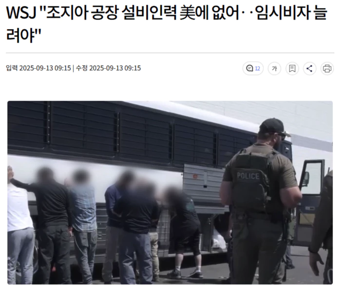미국 이민당국이 조지아주의 현대차그룹-LG에너지솔루션 합작 배터리 공장 건설 현장에서 한국인 노동자 300여 명을 대거 체포한 사태와 관련해, 미 일간 월스트리트저널은 미국이 더 많은 외국인 투자를 받기 위해서는 더 많은 임시 비자가 필요할 것이라고 현지시간 12일 사설을 통해 밝혔습니다.