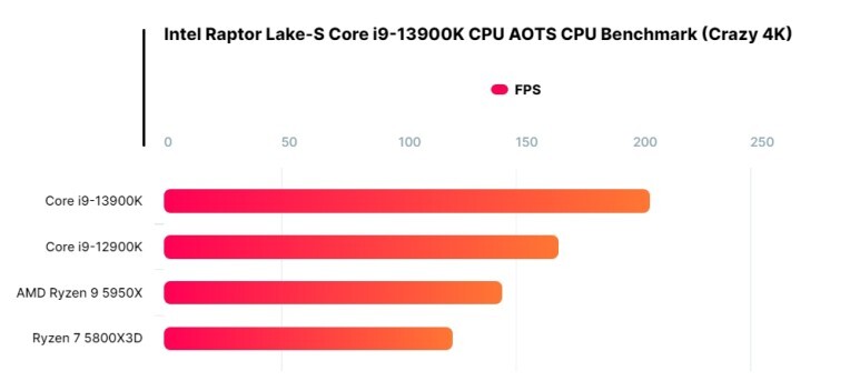 AMD Ryzen 9 5950X는 143.5FPS를 기록했고 Ryzen 7 5800X3D는 121.4FPS를 기록하여 Raptor Lake 플래그십이 두 CPU보다 각각 43% 및 68% 빠릅니다.