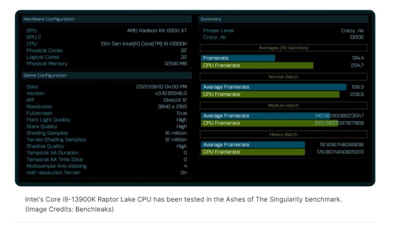 Intel Core i9-13900K Raptor Lake 주력 CPU의 새로운 벤치마크가 Benchleaks 의 Ashes of The Singularity 벤치마크 내에서 유출되었습니다.