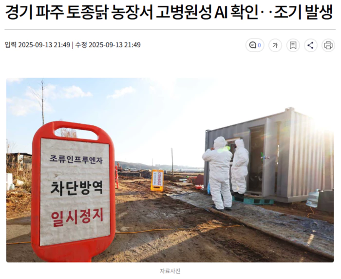 농식품부는 고병원성 AI 확인 즉시 출입 통제, 살처분, 역학조사 등 방역 조치를 실시하고, 조류인플루엔자 위기 경보 단계를 '관심'에서 '주의' 단계로 상향했습니다.