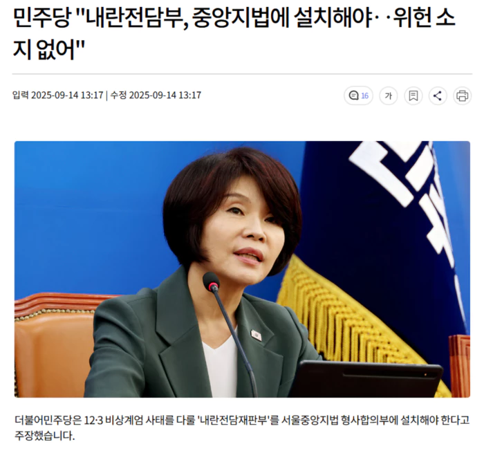 한정애 정책위의장은 오늘 국회에서 기자 간담회를 열고 "지금 우리가 하자는 건 별도 법원을 설치하는 것도 아니고, 서울중앙지법 형사합의부에 내란전담부를 설치하자는 것인데 이게 무슨 문제인지 잘 모르겠다"며 이같이 밝혔습니다.