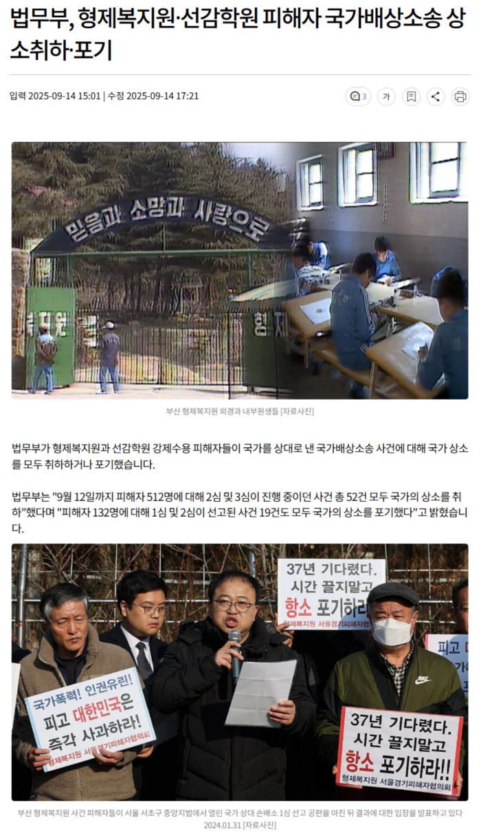 법무부는 그동안 형제복지원, 선감학원 사건 관련 국가배상 소송에서 일괄된 배상 기준을 마련해야 한다는 이유로 상소를 해왔습니다.