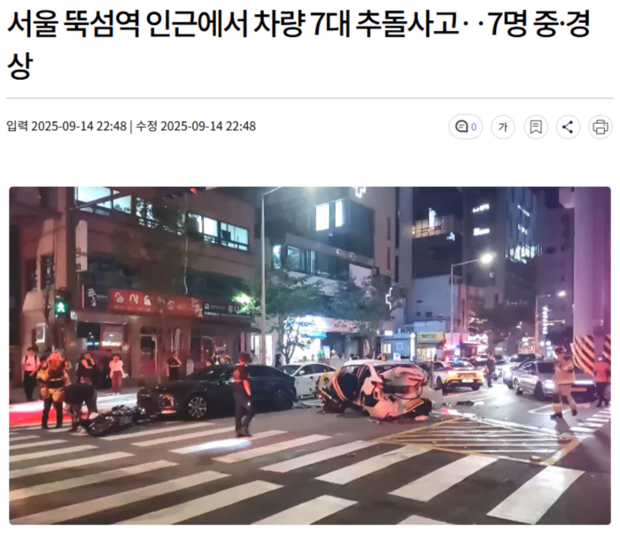 오늘(9/14) 저녁 7시쯤, 서울 성동구 뚝섬역과 성수역 사이 도로에서 SUV가 신호대기 중이던 승용차 4대와 오토바이 2대를 연이어 들이받는 사고가 났습니다.