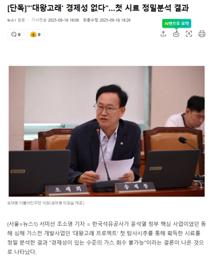 18일 국회 산업통상자원중소벤처기업위원회 소속 송재봉 더불어민주당 의원실이 석유공사로부터 제출받은 자료에 따르면, 석유공사의 정밀 시료 분석 결과 대왕고래 유망구조(석유나 가스 등 자원이 있을 것으로 예상되는 지층구조)의 존재 및 특성은 시추 전 예상과 유사했으나 가스 포화도가 예상 대비 매우 낮은 것으로 확인했다.