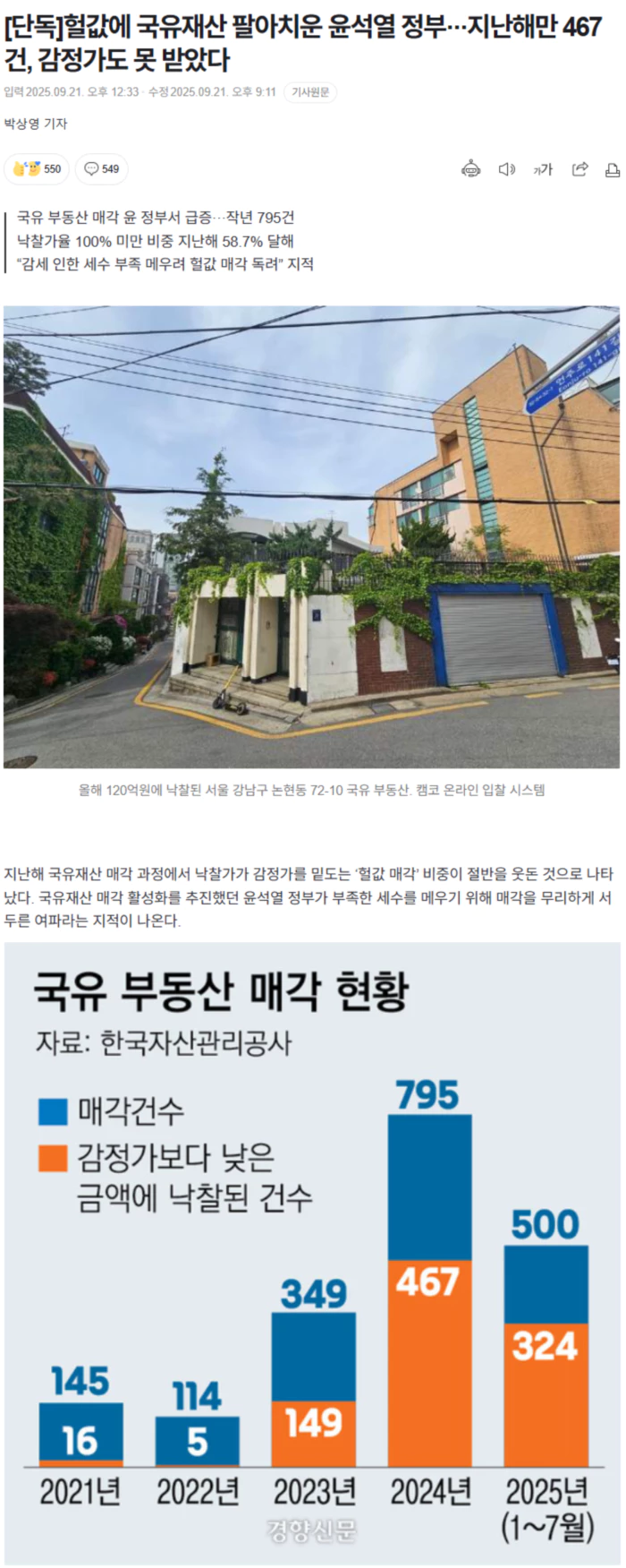 2022년 5월 윤석열 정부 출범 이후 국유 부동산 매각은 빠른 속도로 증가했다. 2021년 145건, 2022년 114건 수준이던 매각 건수는 2023년 300건대로 급증했으며 지난해엔 800건에 가까울 정도로 치솟았다. 올해도 지난 7월까지 이미 500건이 매각돼 증가세가 이어지고 있다.