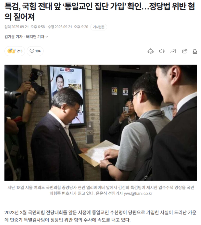 특검팀은 지난 18일 서울 영등포구 여의도에 있는 국민의힘 당원명부 데이터베이스 관리업체를 압수수색하며 통일교 교인으로 추정되는 당원 명단을 확보했다. 앞서 특검팀은 서울 용산구 통일교 한국본부와 산하 단체인 천주평화연합(UPF) 등을 압수수색하며 통일교인 명단을 확보했으며, 당원 가입이 집중됐을 것으로 보이는 특정 기간의 국민의힘 당원 명부와 비교·대조해 공통된 명단을 추출했다. 생년월일 등 개인정보를 대조하며 중복된 명단은 제외했다고 한다.