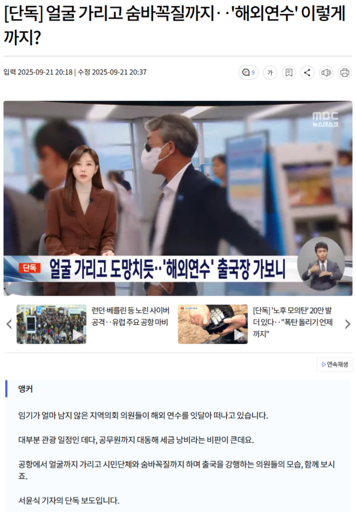 "<외유성 연수라는 지적에 대해선 어떻게 생각하십니까?> 잘 다녀오도록 하겠습니다. 죄송합니다."