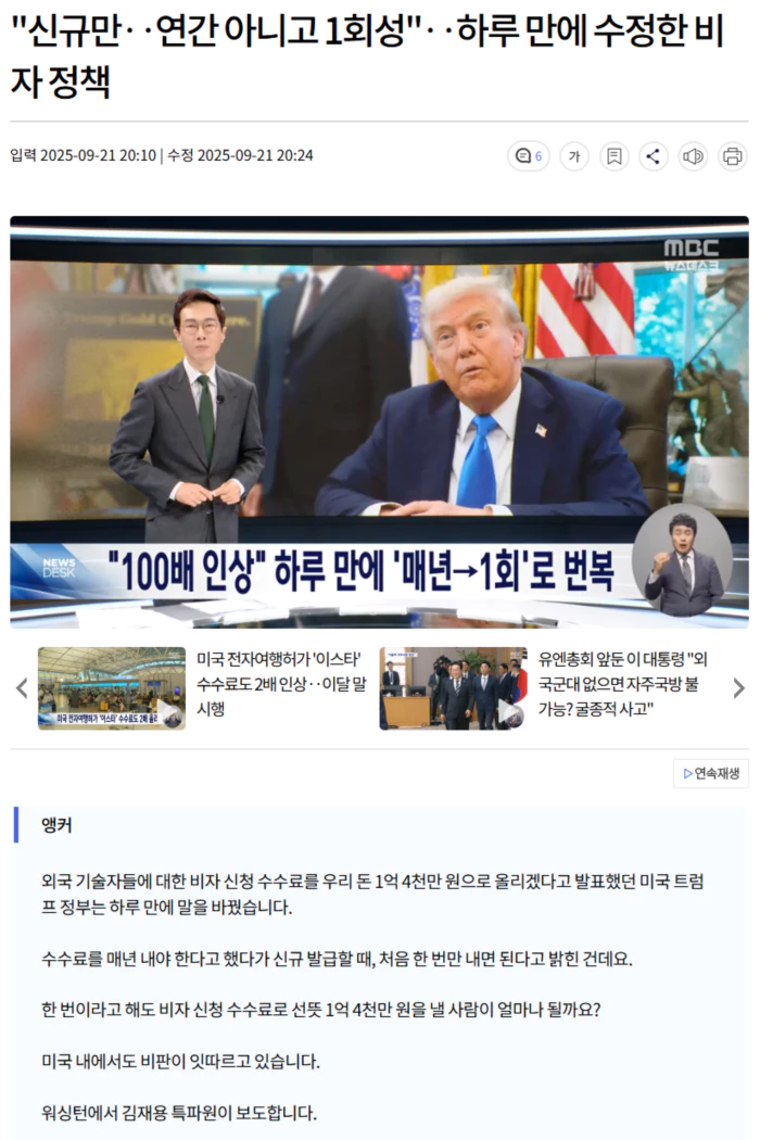 트럼프 정부는 원래 1천 달러인 H-1B, 즉 전문직 비자 수수료를 100배 올리며, 그것도 매년 갱신해야 한다고 발표했습니다.