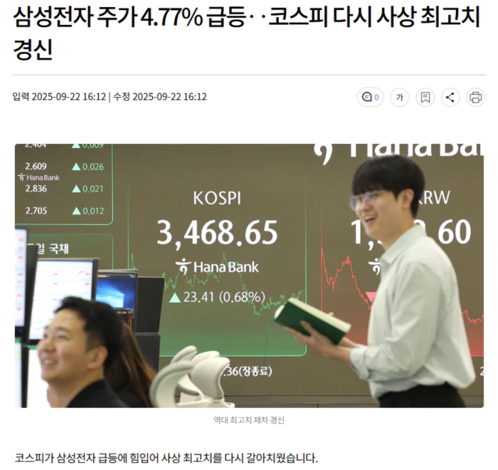 오늘(9/22) 코스피는 지난주 금요일 장보다 23.41포인트, 0.68% 오른 3,468.65에 장을 마쳤습니다.
