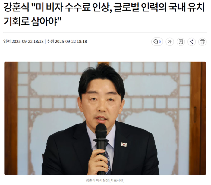 대통령실 강훈식 비서실장은 미국 정부가 'H-1B' 비자 수수료를 인상한 데 대해, 이공계 인력의 국내 유치 기회로 활용할 수 있을 거라는 의견을 냈습니다.